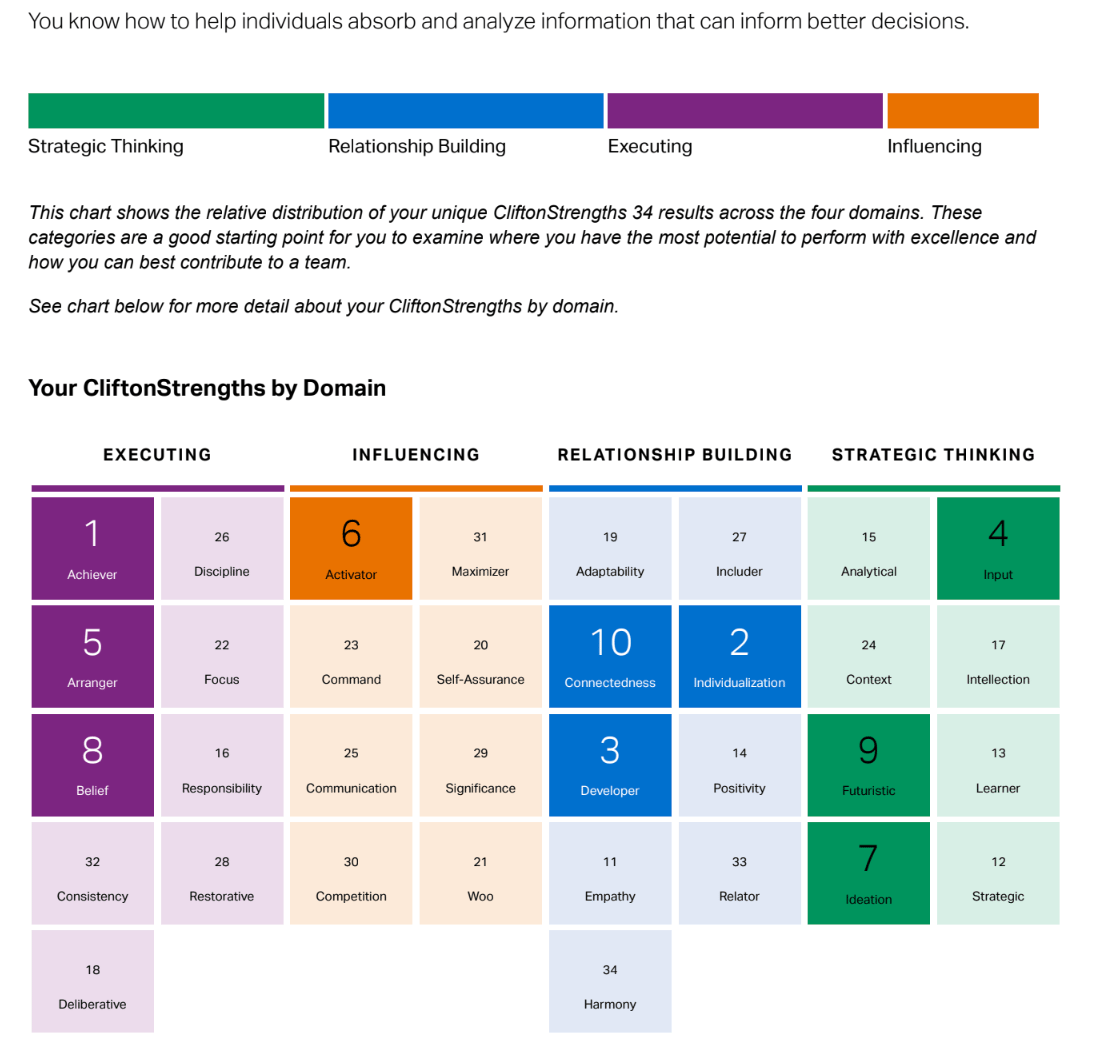 You can find my detailed CliftonStrengths report here.